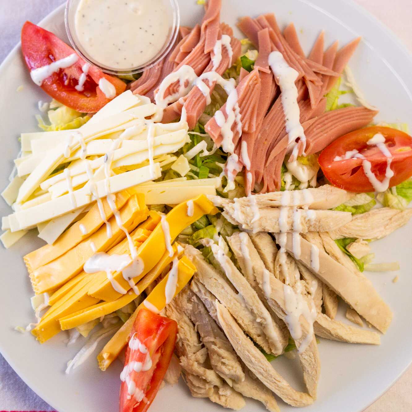 cama de lechuga acompañada de jamon de pavo , queso americano ,queso chihuahua , pechuga cocida y gajos de jitomate con aderezo ranch
