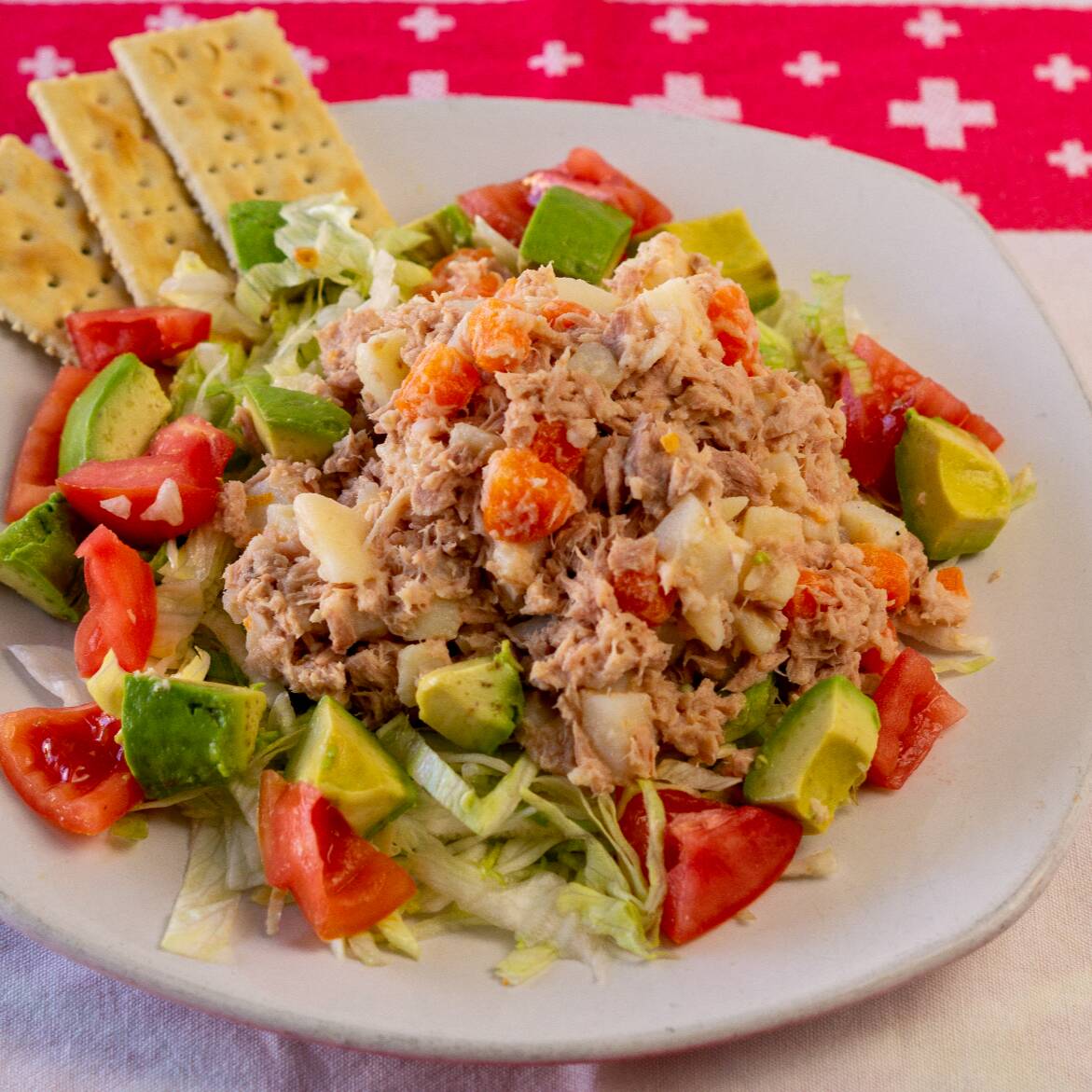 Ensalada de atún con mayonesa light acompañado con galletas saladas