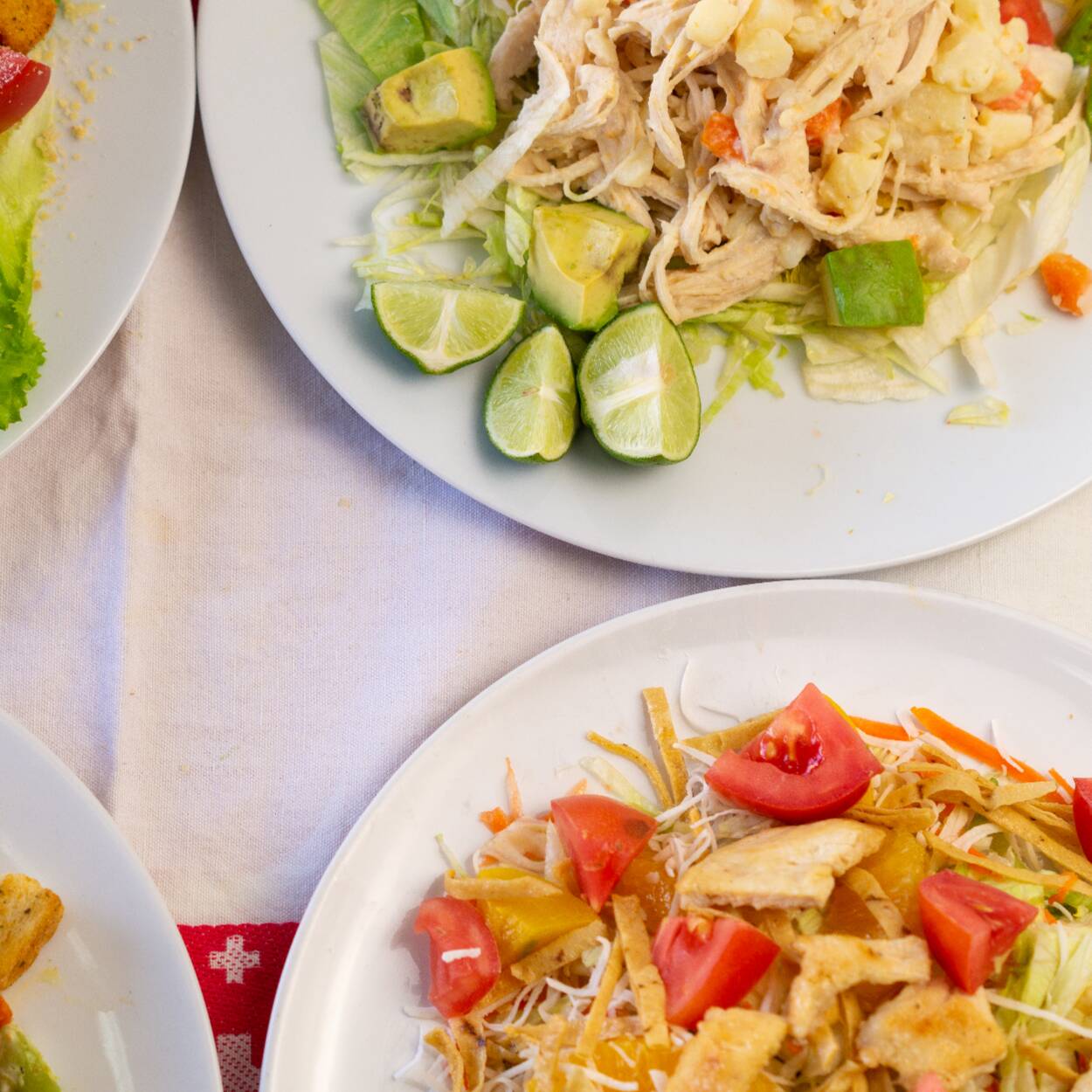Lechuga troceada y aderezada acompañada de queso parmesano , crutones de pan , jitomate y aguacate y trozos de milanesa de pollo