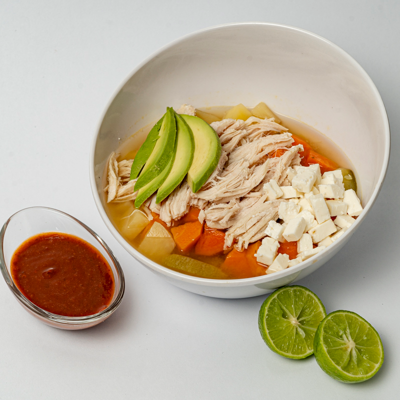 Delicioso caldo tlalpeño hecho con verduras, pechuga de pollo, queso panela, aguacate y chile chipotle.