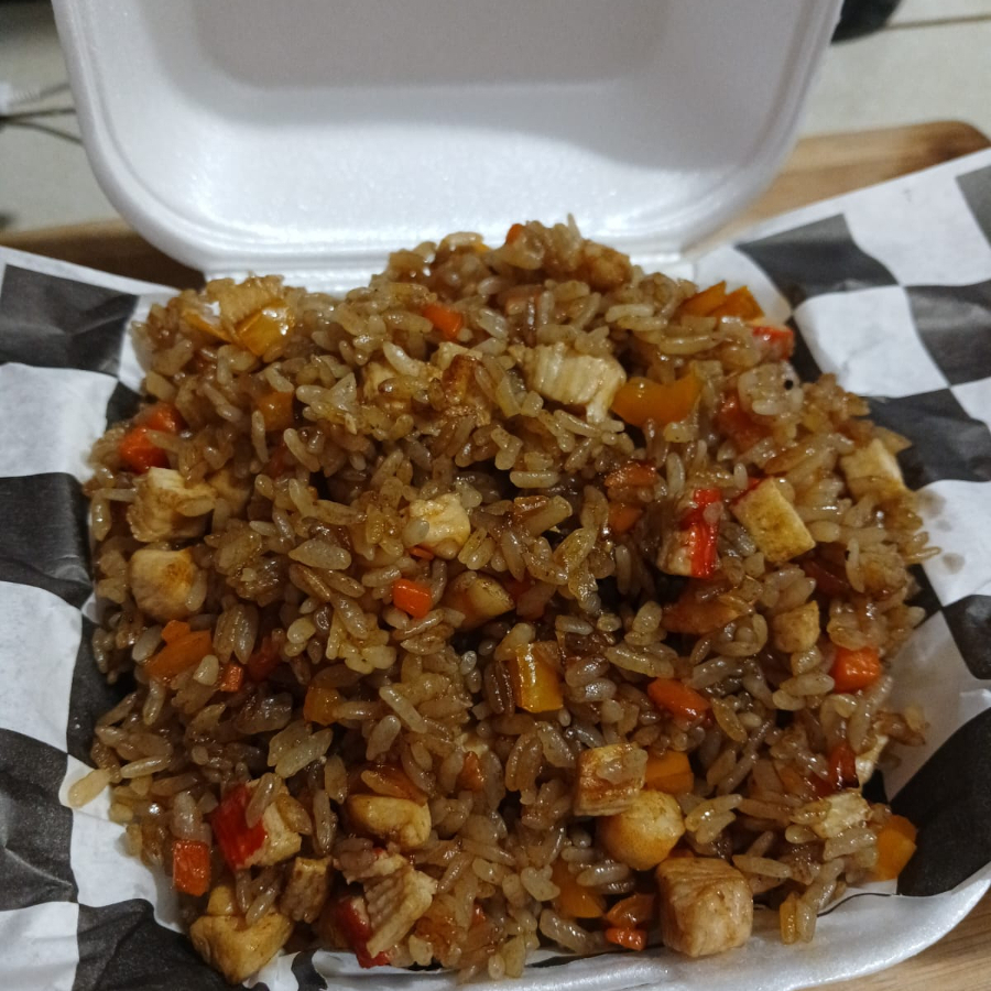 ARROZ FRITO, CON GERMEN DE SOYA, ZANAHORIA, PIMIENTO VERDE, CEBOLLÍN Y POLLO, BAÑADO EN SALSA SOYA