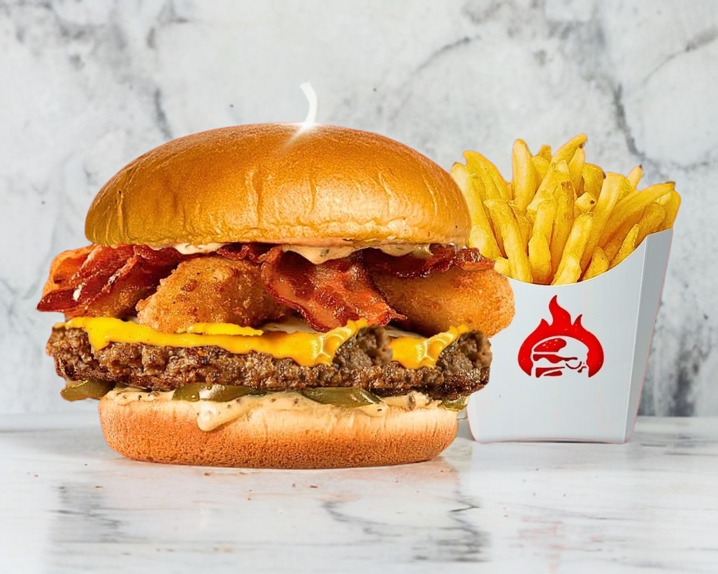 Pan brioche,aderezo especial est,tocino, 3 chile poppers rellenos de queso Philadelphia, carne de res,doble queso,chiles en vinagre y porción de papas
