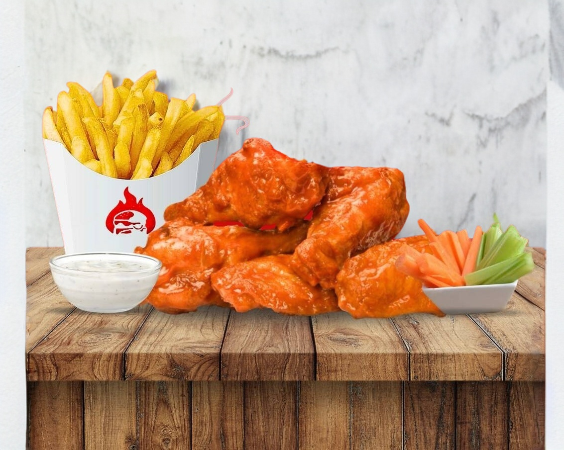 1 kilo de boneless bañados a tu salsa a elegir,papas fritas ,apio,zanahoria y aderezo ranch