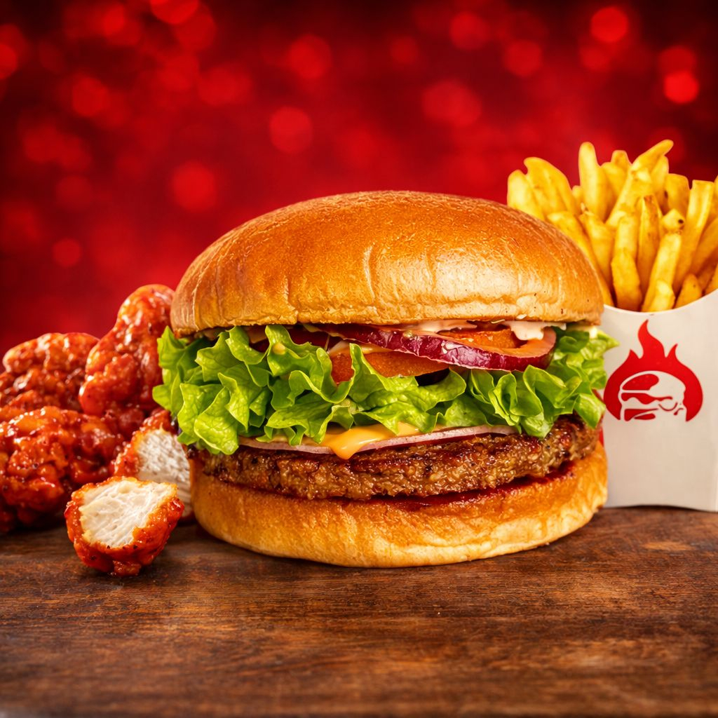 Burger clasica(pan brioche,aderezo especial, carne 100% de res,queso americano, lechuha,tomate,cebolla,pepinillos) 15 delicioso boneless bañados con tu salsa a elegir, apio,zanahoria y aderezo ranch