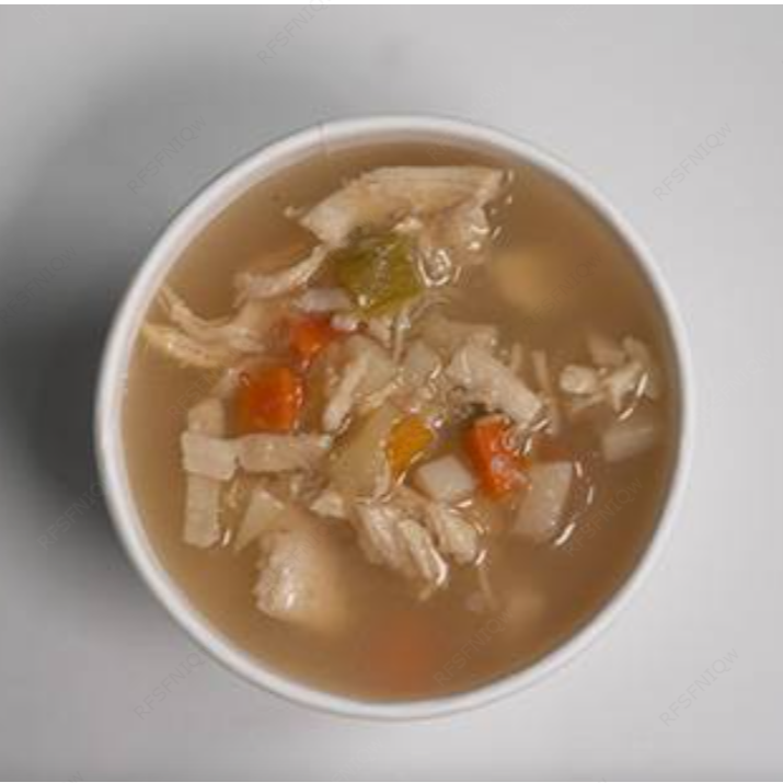 Caldo de pollo con verduras y pollito desmenuzado.