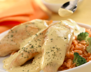 Preparado con pechuga de pollo, crema, chile poblano y champiñones.