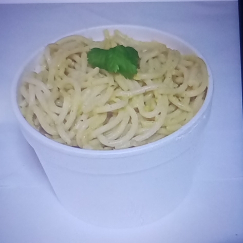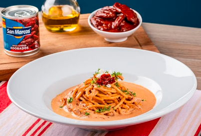 pechuga de pollo en salsa de crema y chile chipotle acompañada de pure y spaguetti