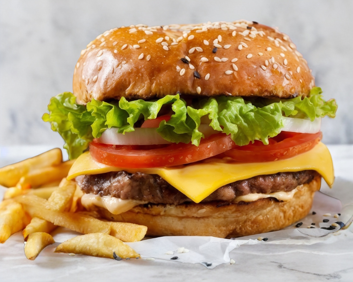 Carne de res, jamón, queso amarillo acompañado vegetales acompañado de papas a la francesa
