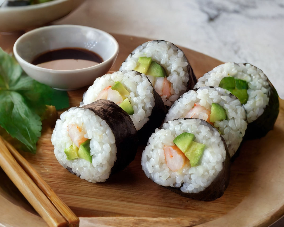 Sushi de Camarón, Aguacate, Pepino y queso crema.
