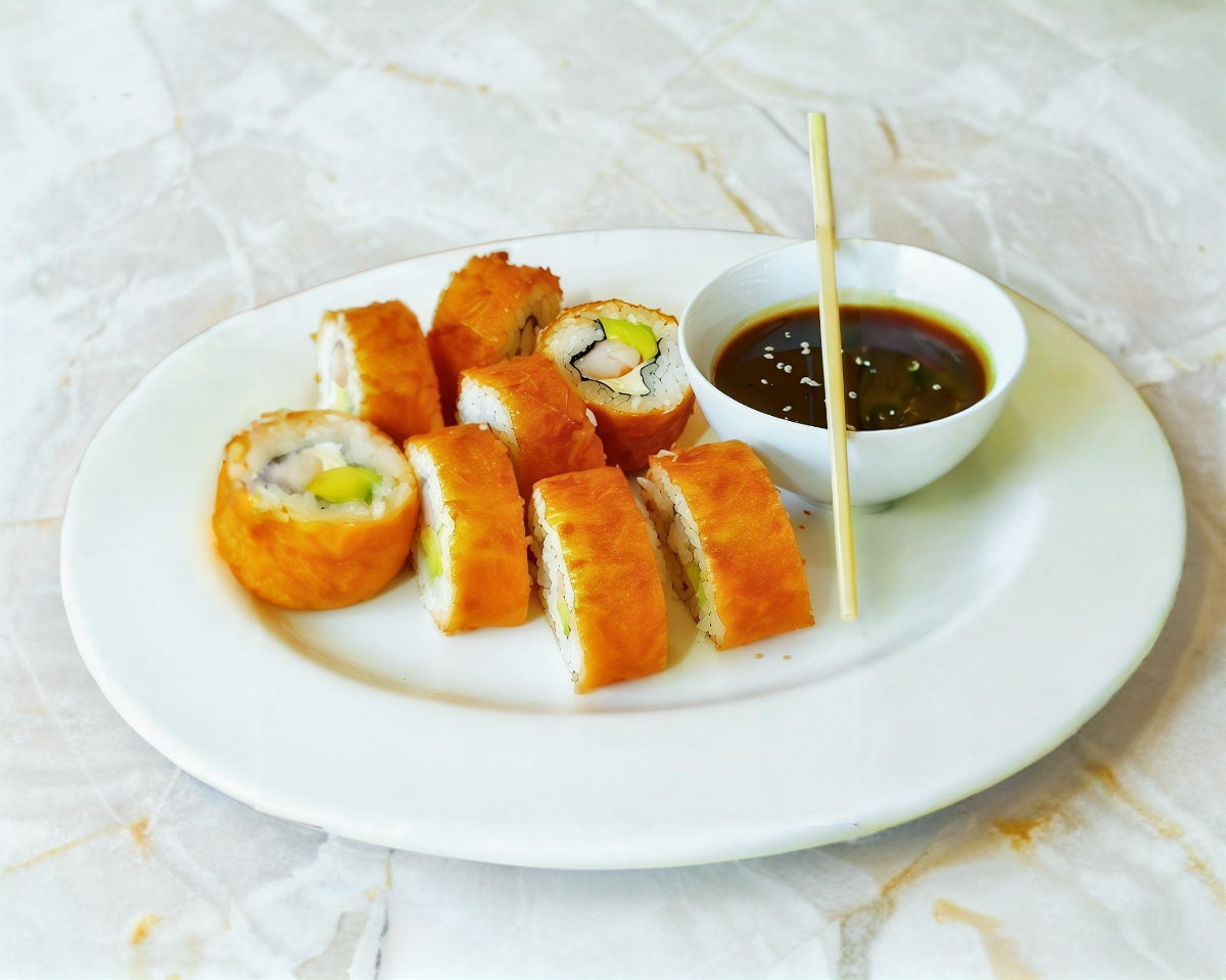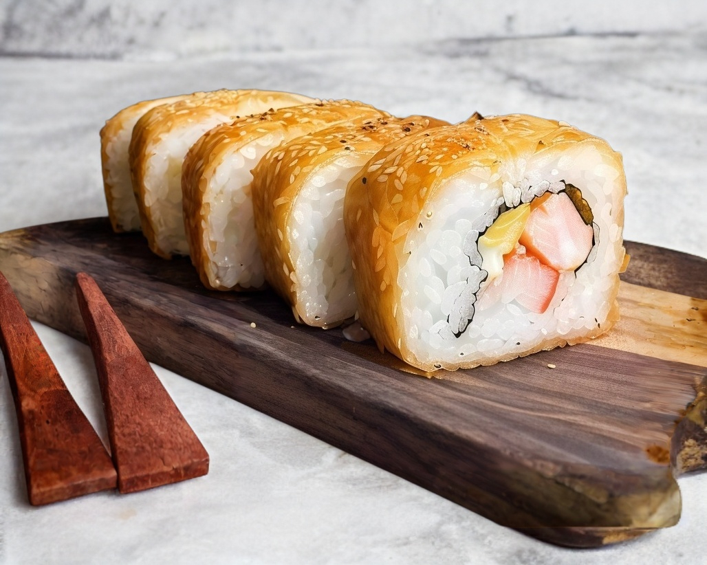 Sushi empanizado de Camarón, Aguacate, Pepino y queso crema.