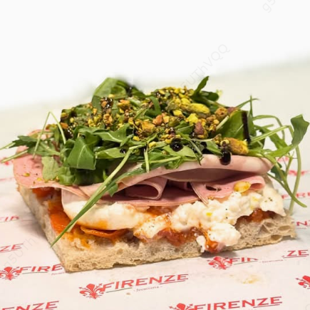 Burrata, mortadella pistacchio, tomate dulce, miel de balsámico, arúgula, pistacchio triturado, aceite de oliva, sal y pimienta.