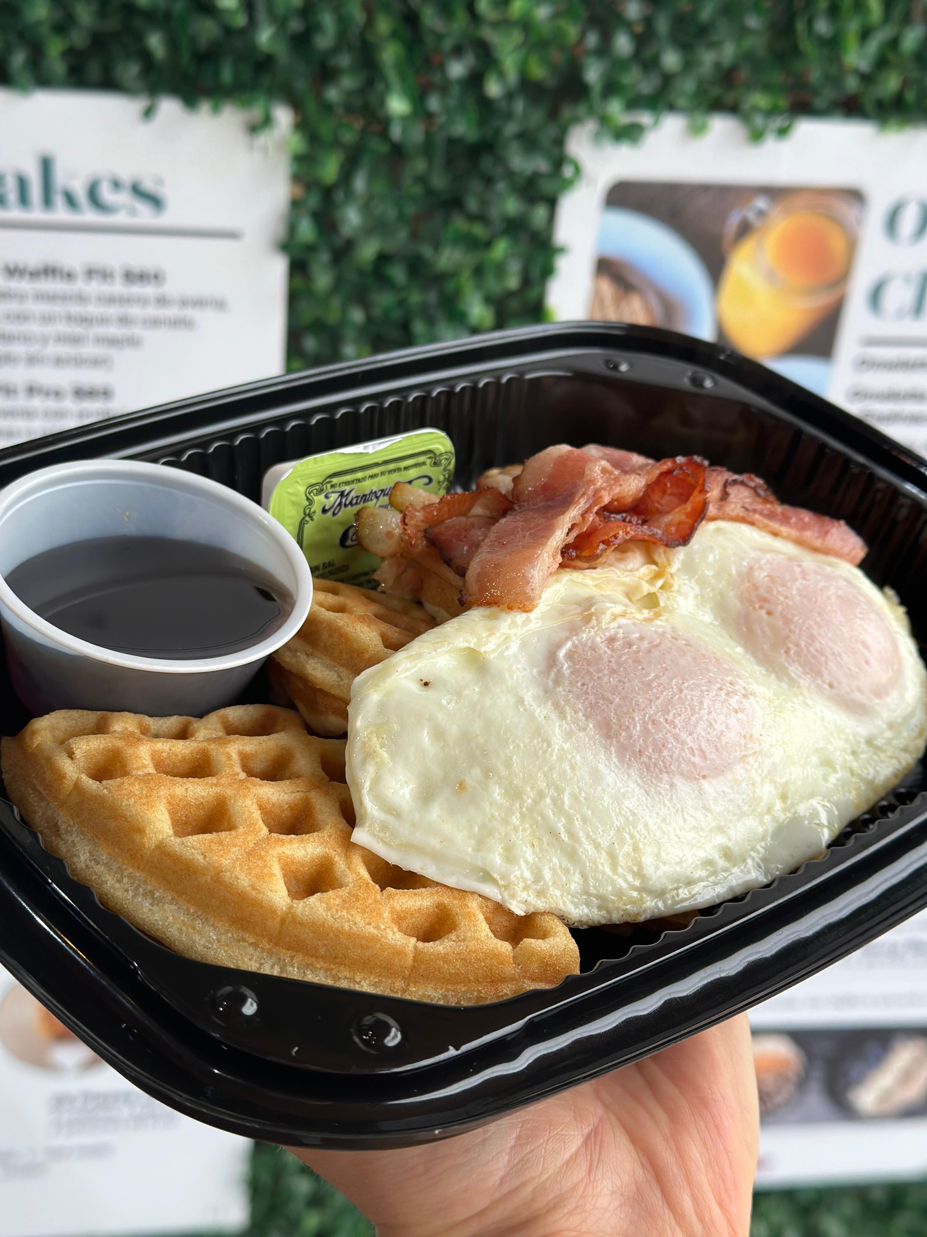 Waffle clásico (4 triángulos) con 2 huevos revueltos o estrellados y 2 tiras de tocino. Acompañado con jarabe sabor maple y mantequilla.
