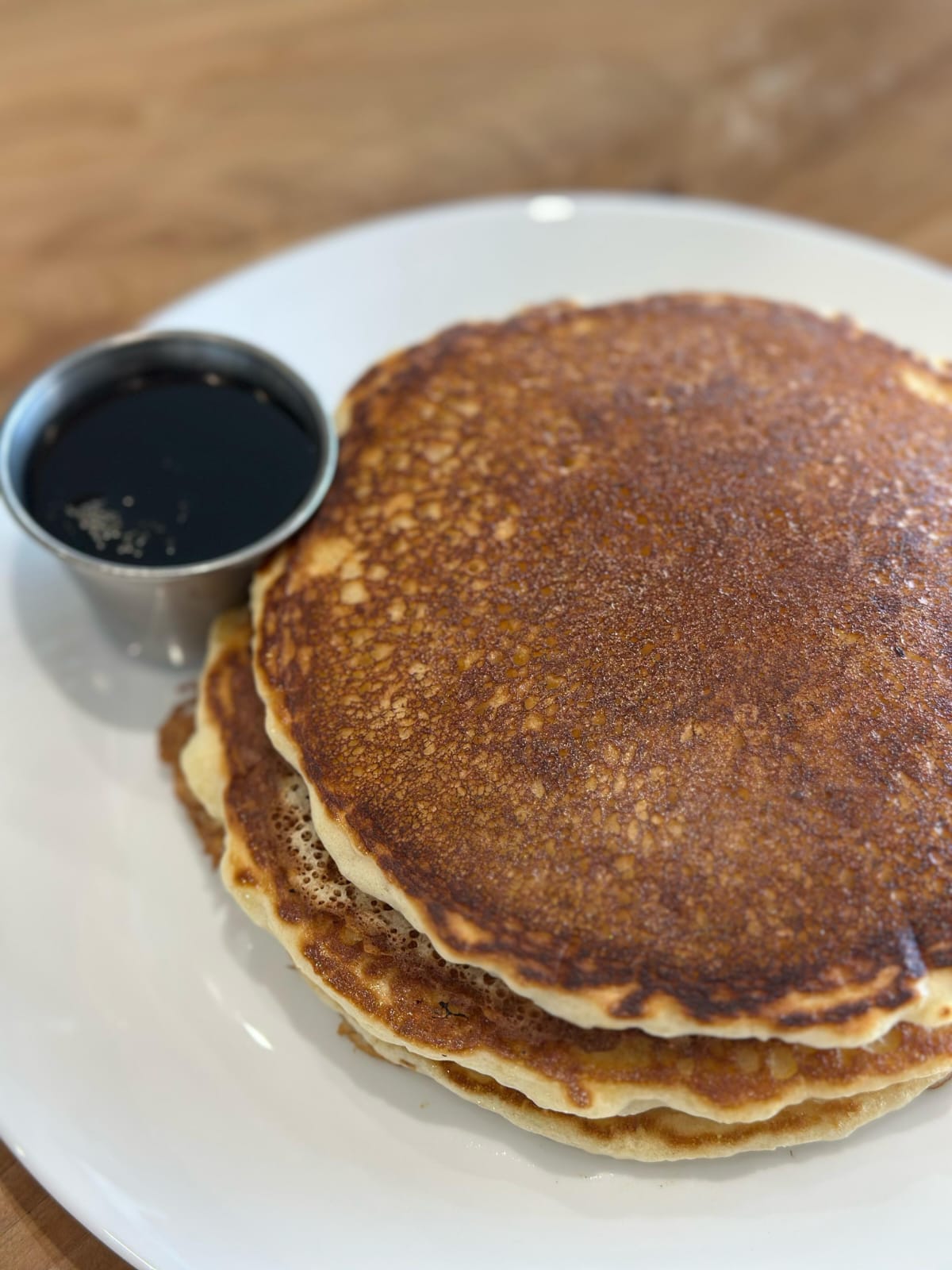 Hot cakes clásicos con nuestra mezcla casera de la casa. Acompañados con mantequilla y miel maple (3 piezas de hot cakes).