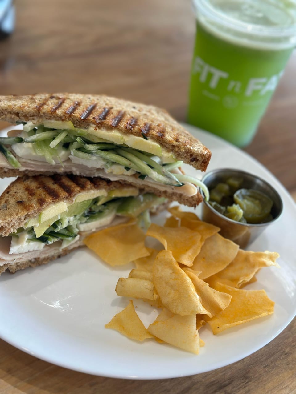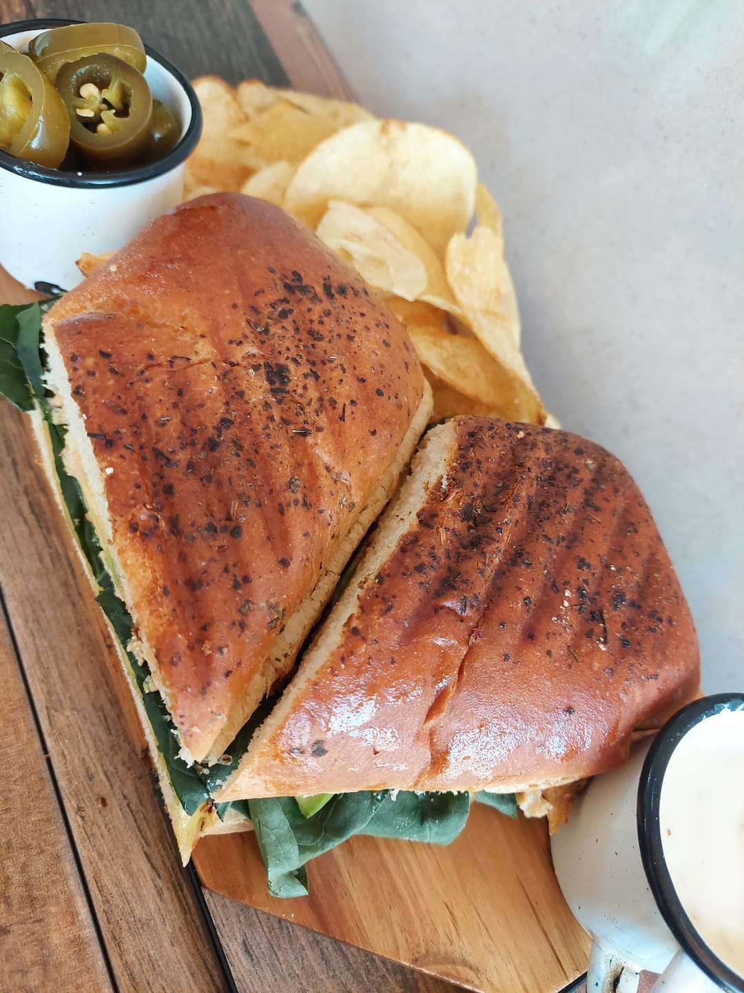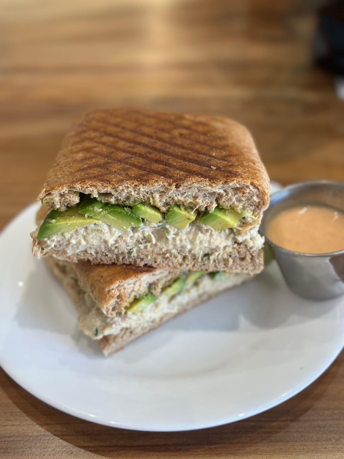 Panini pan a las finas hierbas, con mayo-chipotle, queso manchego, pollo a la plancha, espinacas y aguacate.