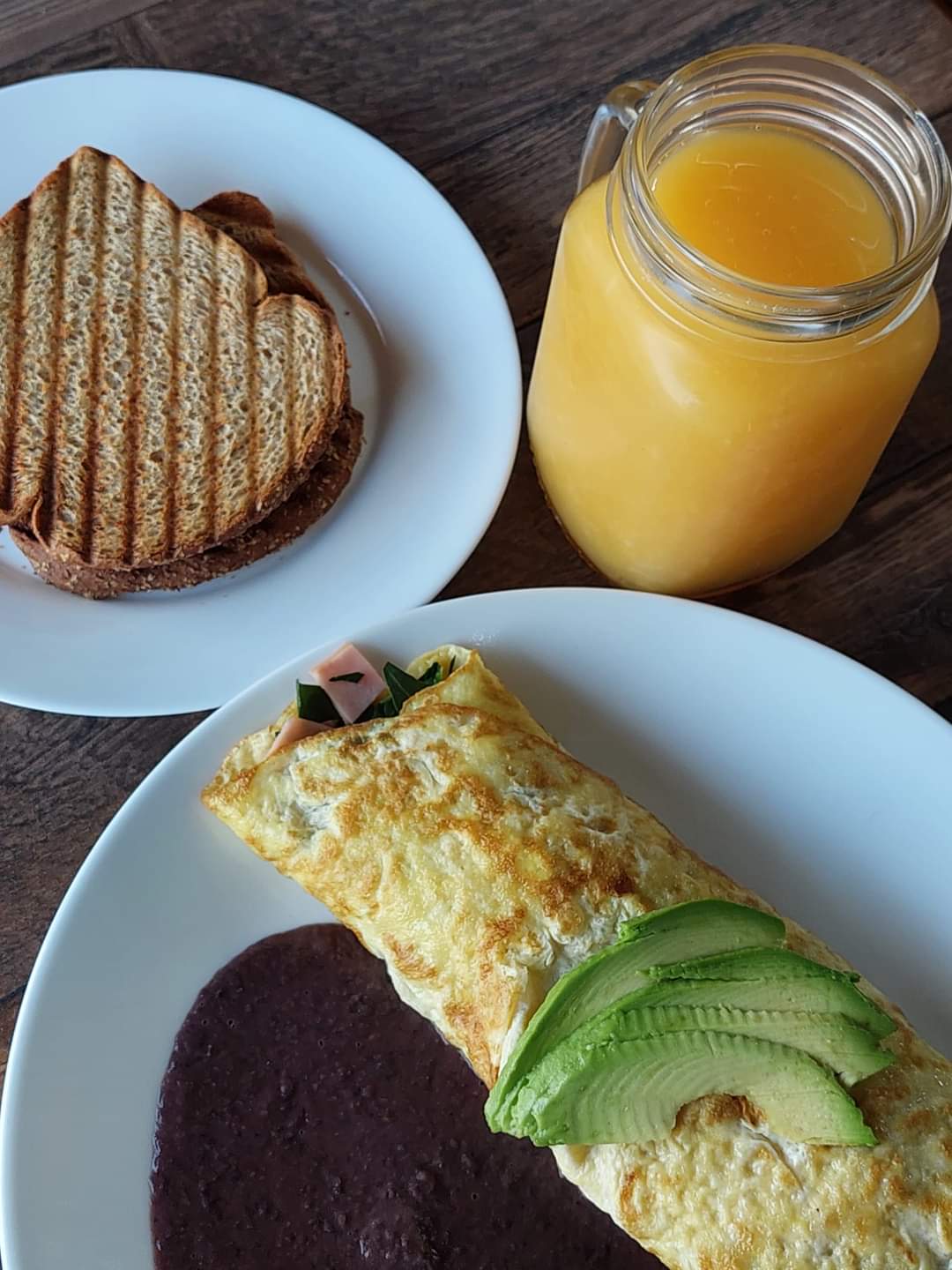 Omelette relleno de pechuga de pavo y queso manchego, acompañado de frijoles negros refritos, salsa roja y pan tostado.