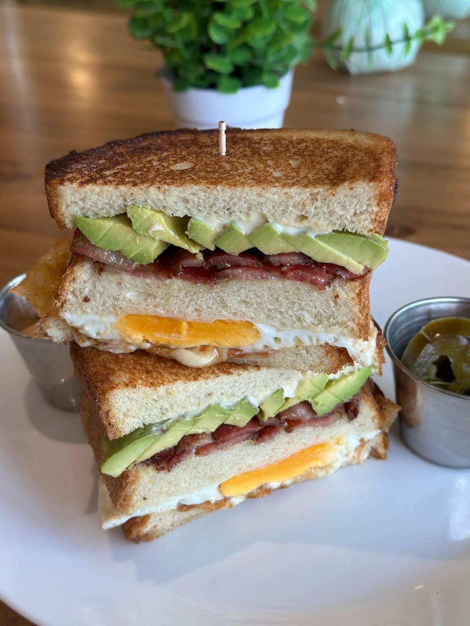 Pan blanco con mayonesa, tocino, costra de queso manchego, aguacate y huevo estrellado cocido.