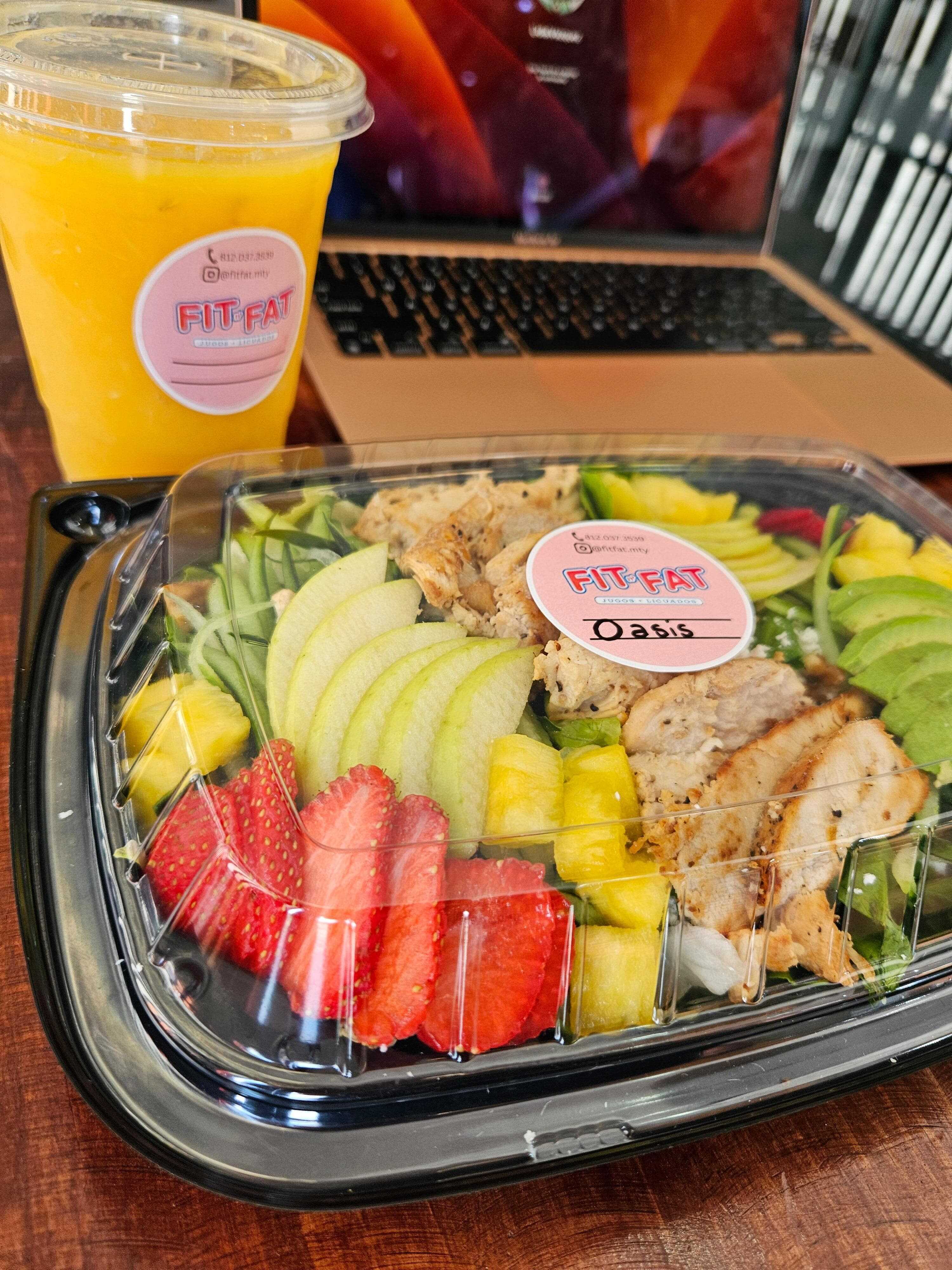 Mix de lechugas, con queso panela, nuez, fresa, piña, aguacate y pollo a la plancha. Acompañada de aderezo de mostaza con miel.