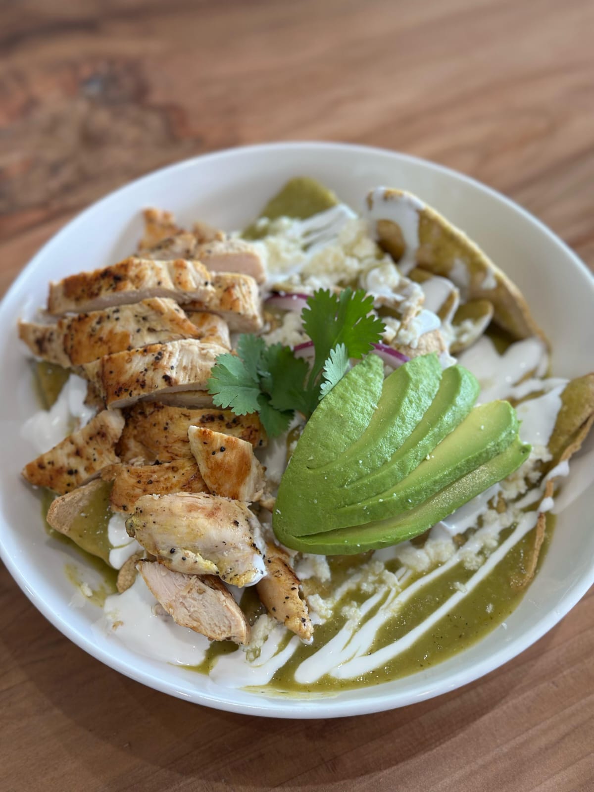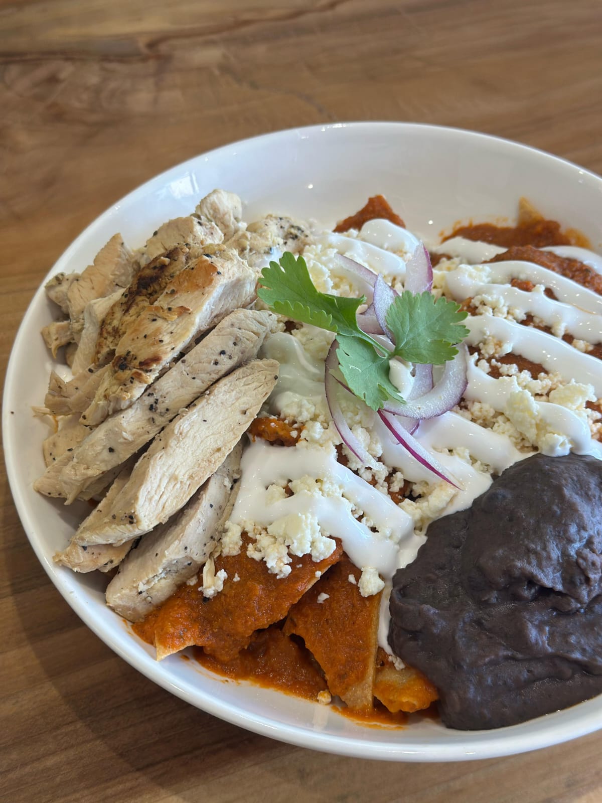 Totopos bañados en nuestra salsa verde o roja, con pollo a la plancha, frijoles negros refritos, cebolla morada curtida y cilantro. Queso fresco y crema.