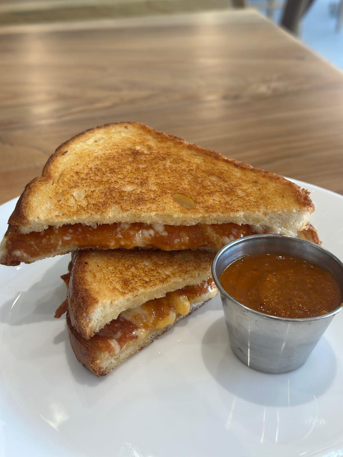 Pan blanco dorado con mantequilla, mayo y quesos a la plancha (cheddar, manchego y queso Monterrey Jack).