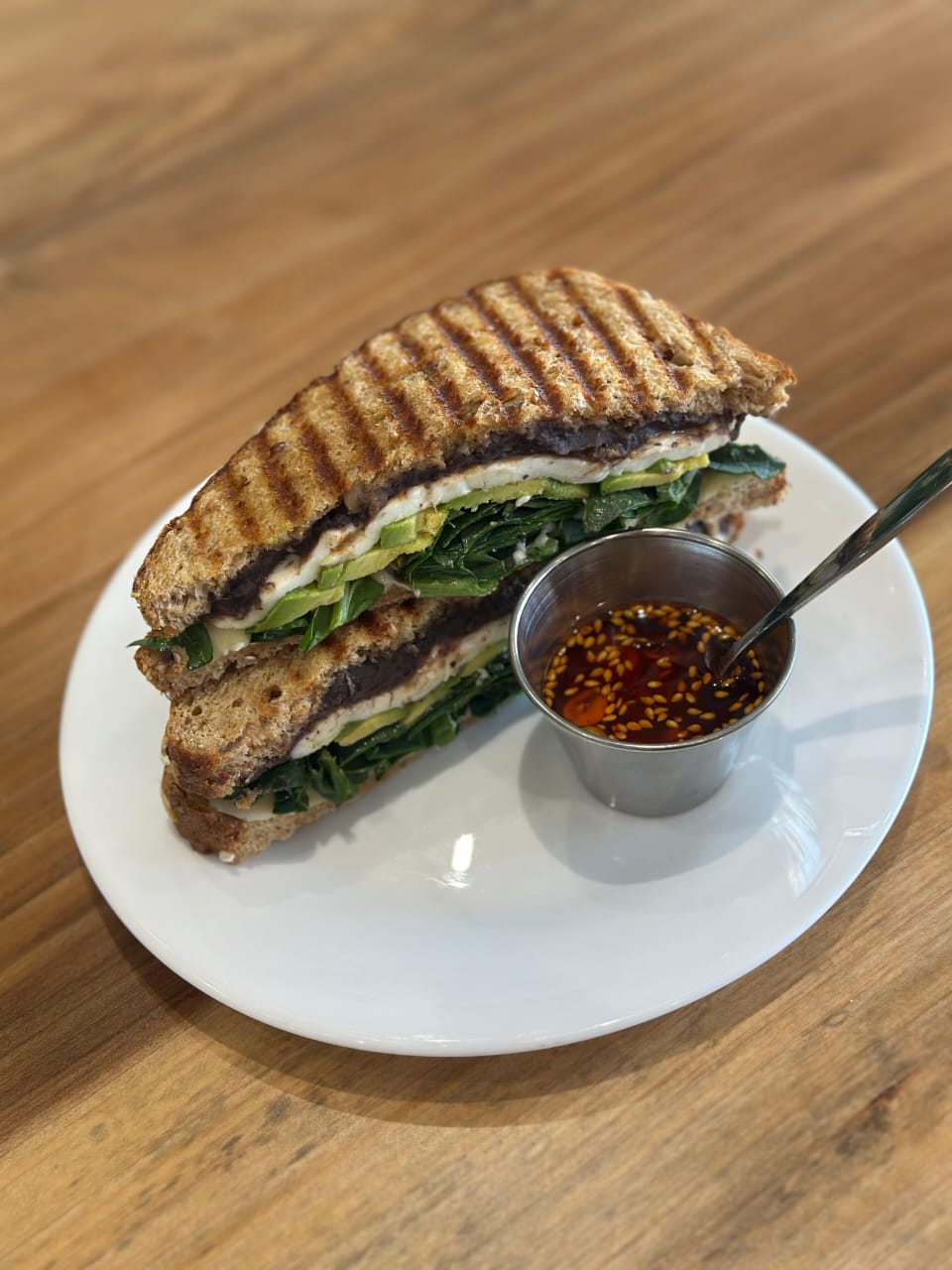 Pan integral orgánico 21 granos, mayo, frijolitos negros refritos, costra de queso manchego, queso panela asado, espinacas y aguacate.