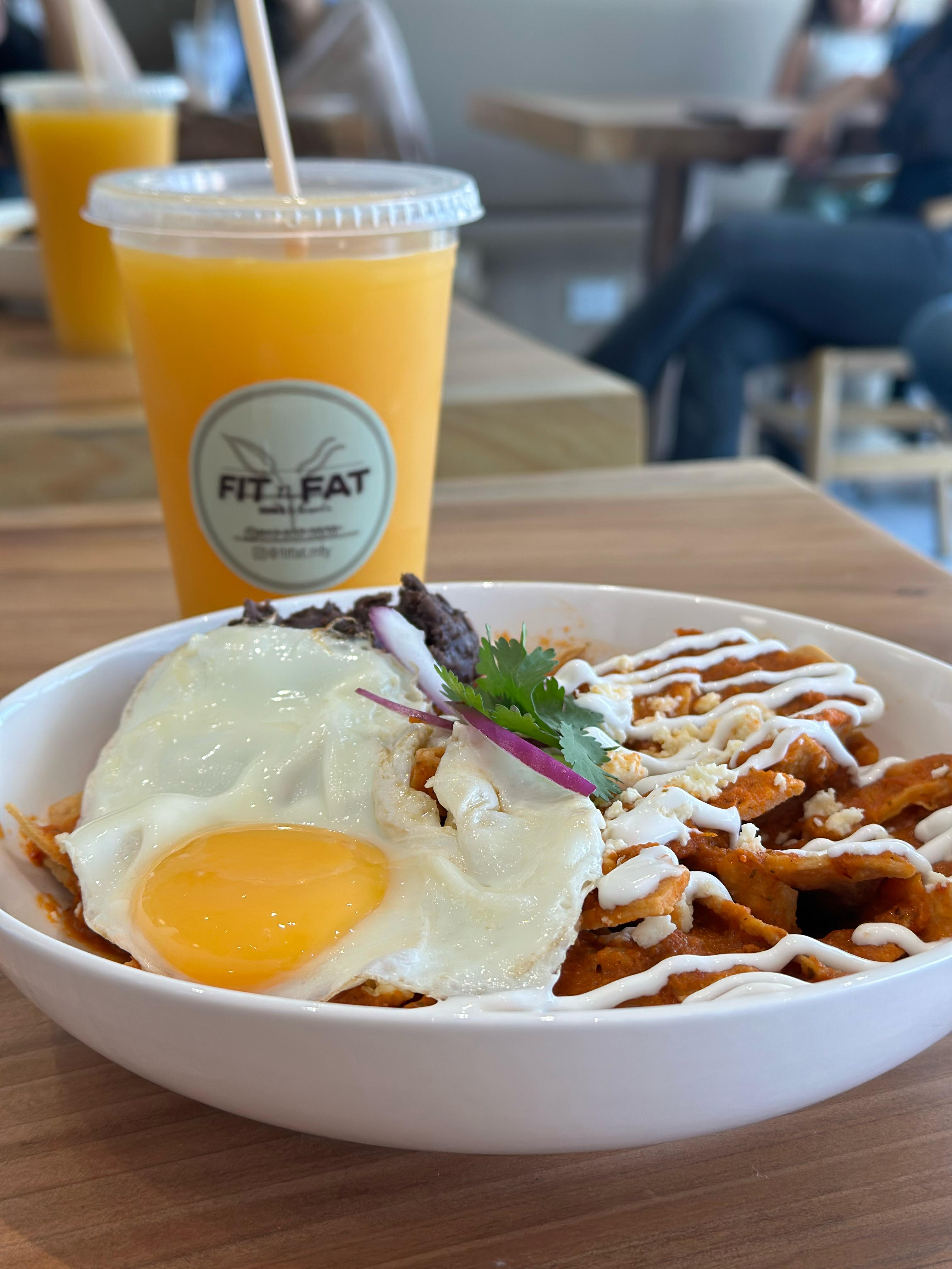 Totopos bañados en nuestra salsa verde o roja, con huevo, frijoles negros refritos, cebolla morada curtida y cilantro. Queso fresco y crema.