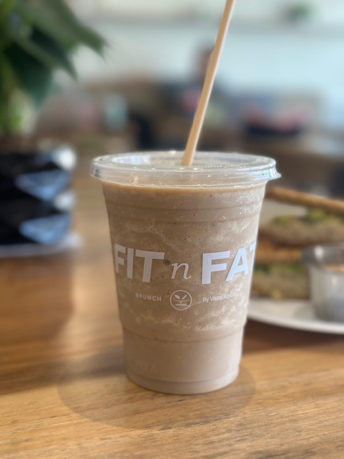 Licuado de plátano, crema de cacahuate, avena y café frappeado.
