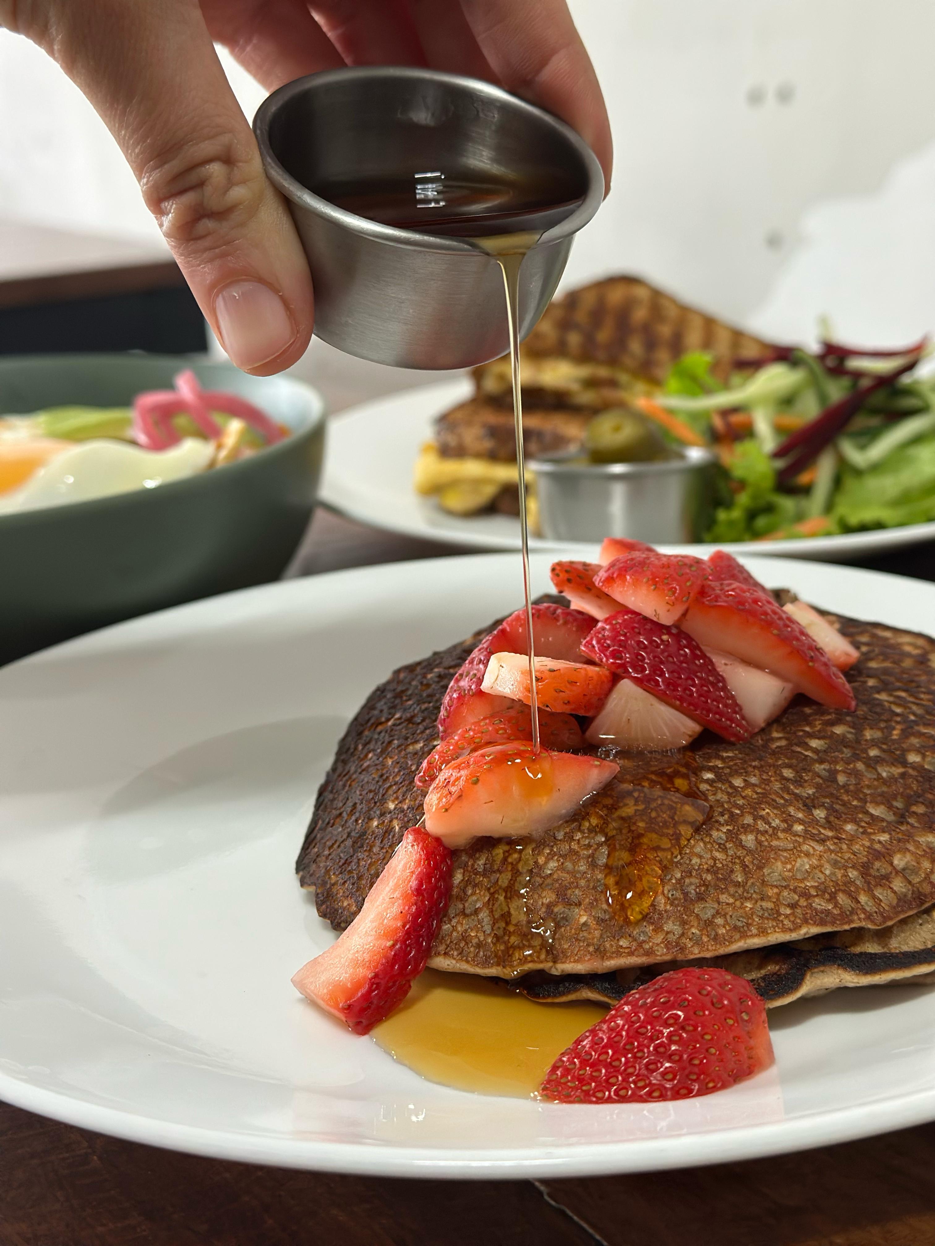 3 Piezas de hot cakes en nuestra mezcla de avena, plátano, huevo y con un toque de canela. ¡Sin harinas, ni azúcares añadidos! Incluye jarabe sabor maple sin azúcar.