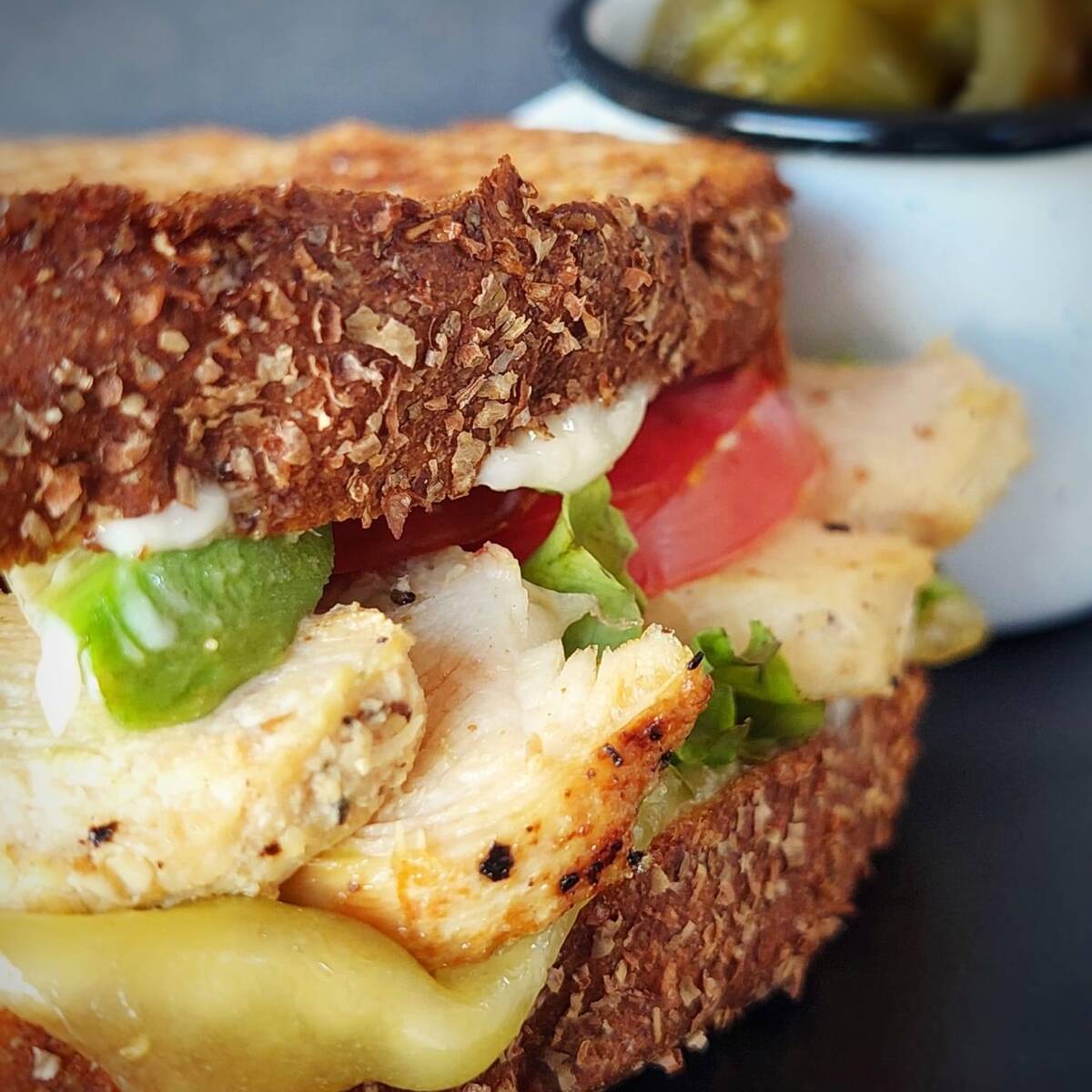 Pan integral orgánico con 21 granos, mayonesa, queso manchego, pollo a la plancha, lechuga, aguacate y tomate.