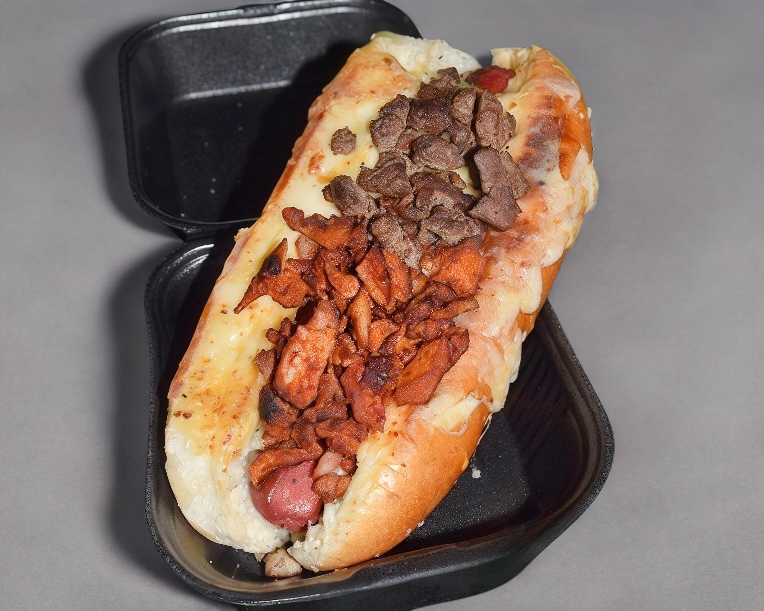 22 cm. Sabroso dogo con carne asada, trompo, queso gratinado y salchicha de pavo de 22 cm. Incluye papas francesas.