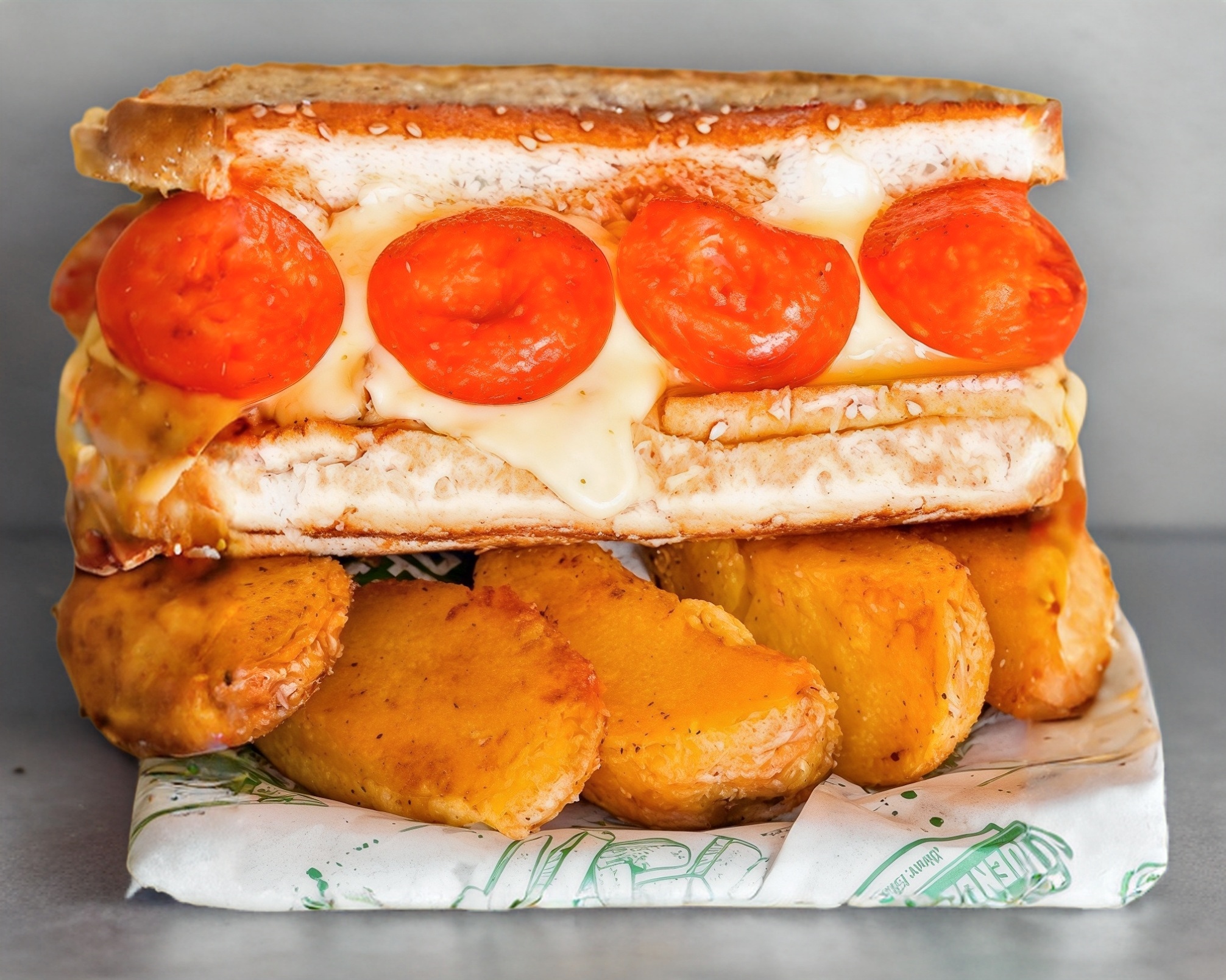 22 cm. De nuestro favorito dogo con salsa de tomate, mix de quesos, pepperoni y salchicha de pavo de 22 cm. Incluye papas francesas.