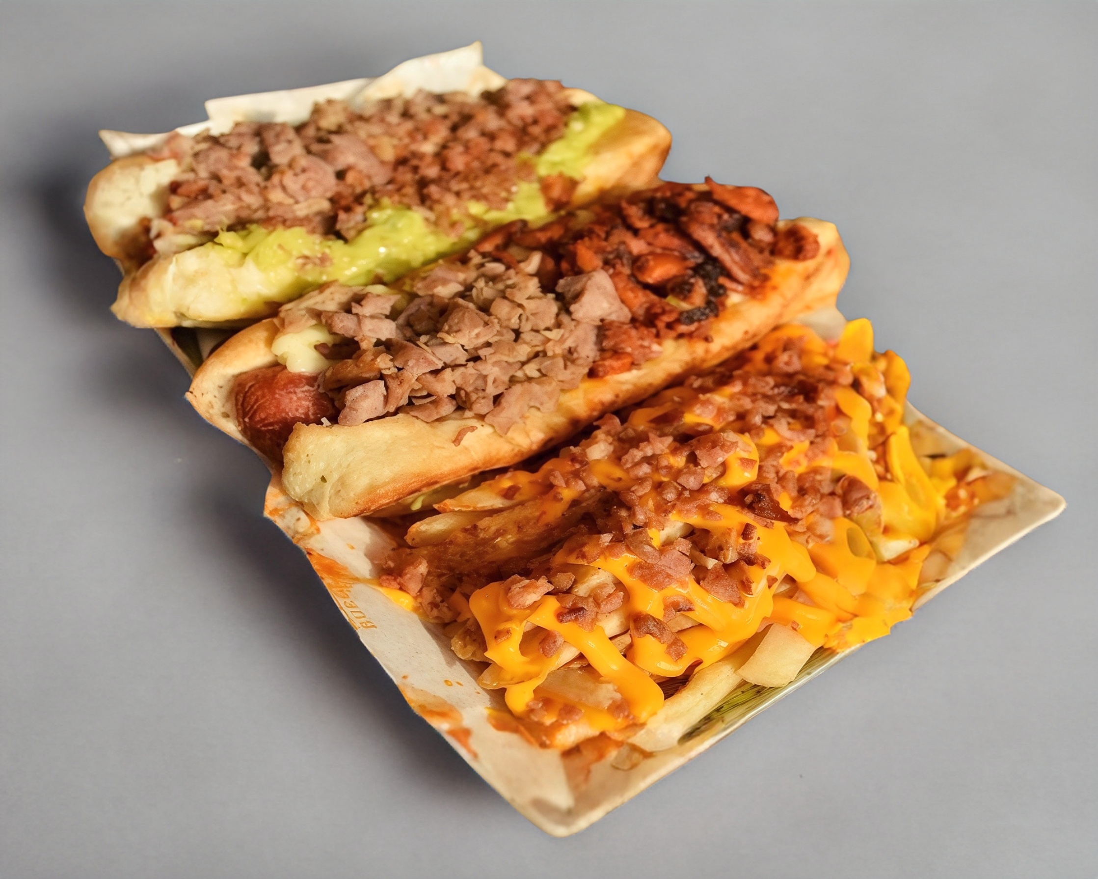 2 Sabrosos dogos a elección de 22 cm. con salchicha, queso y tocino, incluye papas francesas, queso y tocino.