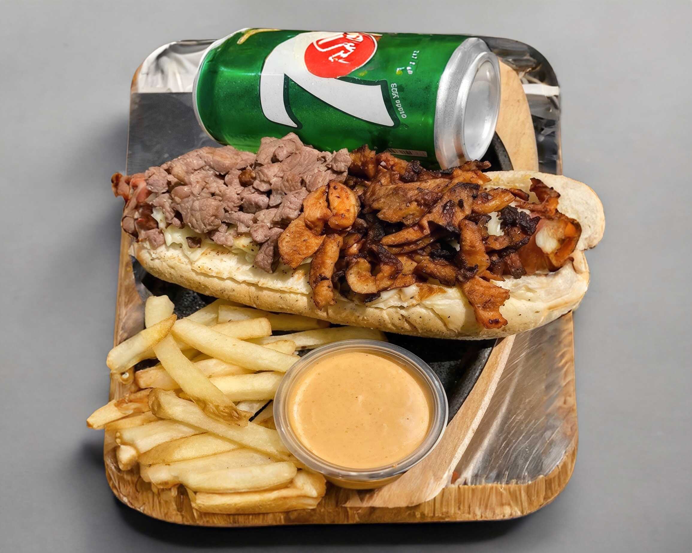 22 cm. Deliciosos boneless bañados, con queso gratinado, queso cheddar y salchicha de pavo de 22 cm. Incluye papas francesas.