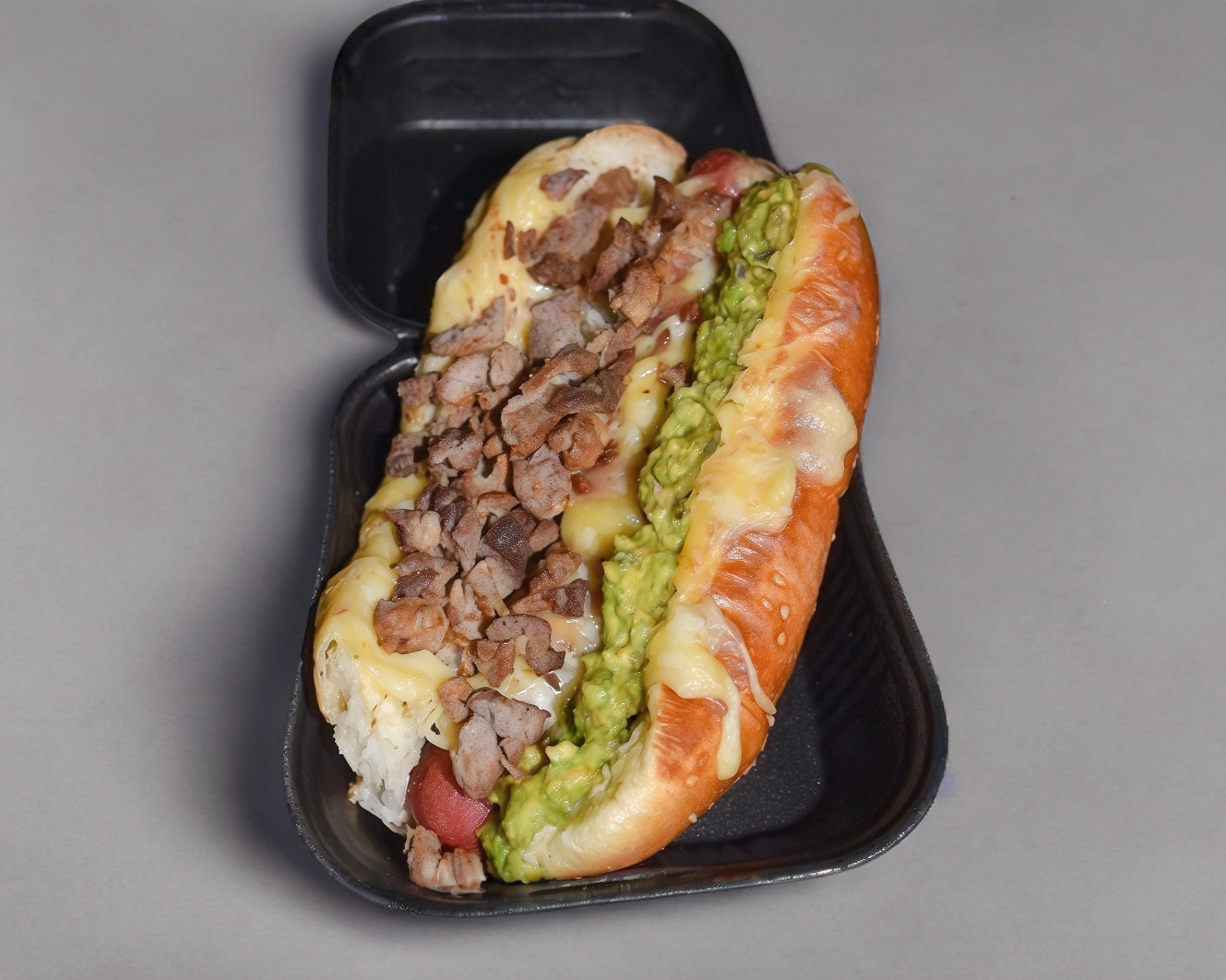 22 cm. Delicioso dogo con carne asada y guacamole, queso gratinado, tocino y salchicha de pavo de 22 cm. Incluye papas francesas.