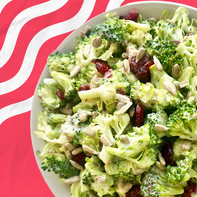 Ensalada de brocoli crudo con arándanos, semillas de girasol y un toque de tocino dorado con aderezo especial
