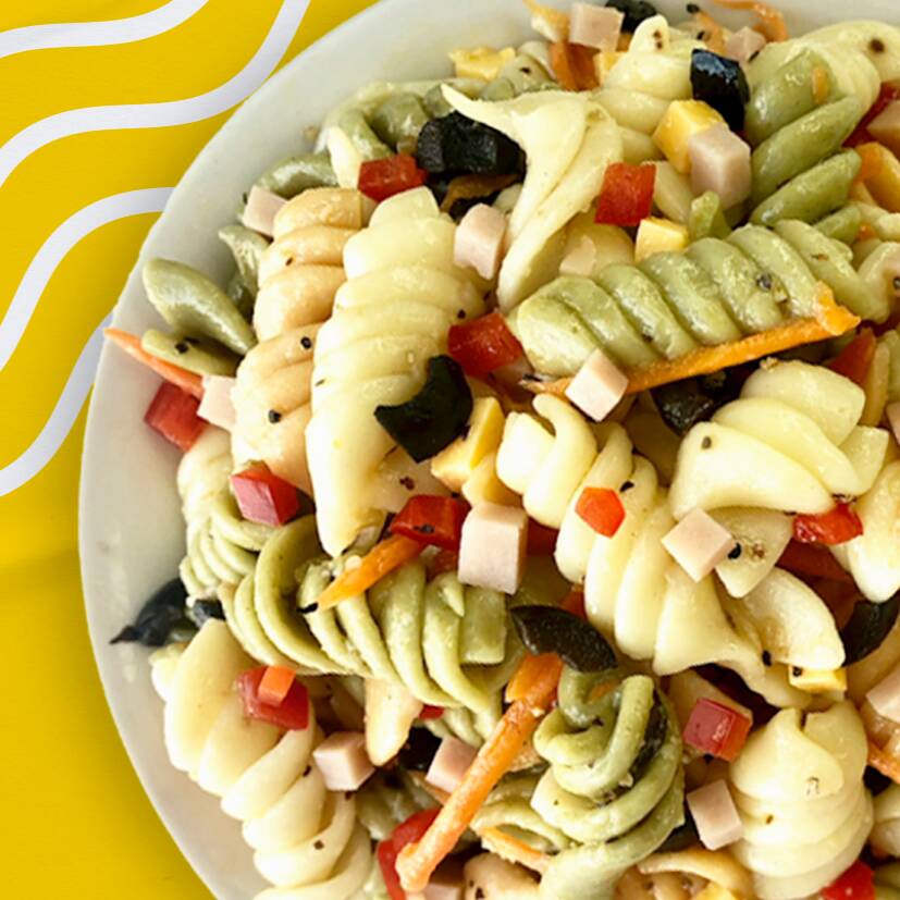 Ensalada de pasta rotini con zanahoria rallada, pimiento morrón rojo, jamón de pierna, queso cheddar y un toque de aceituna negra con aderezo italiano de la casa