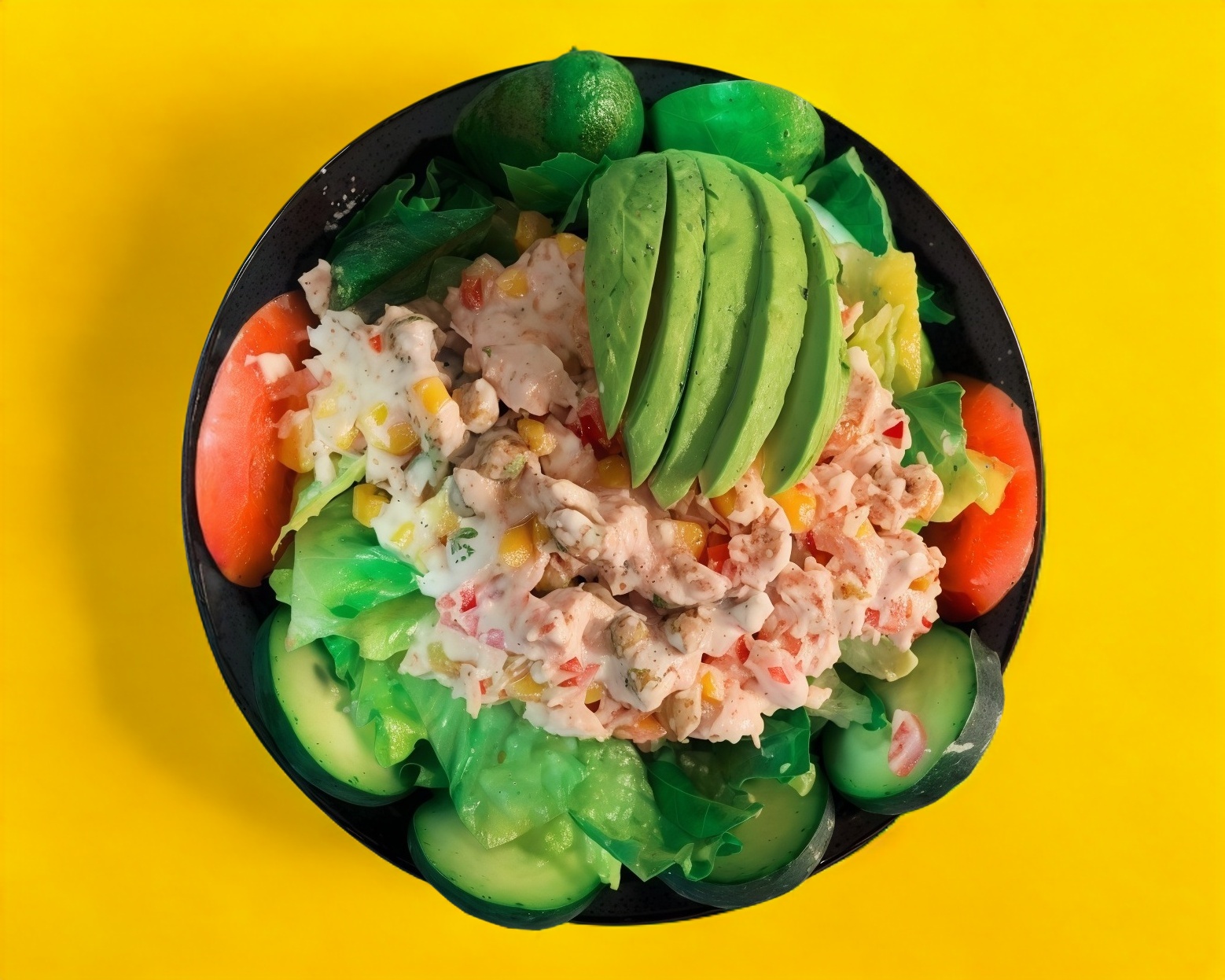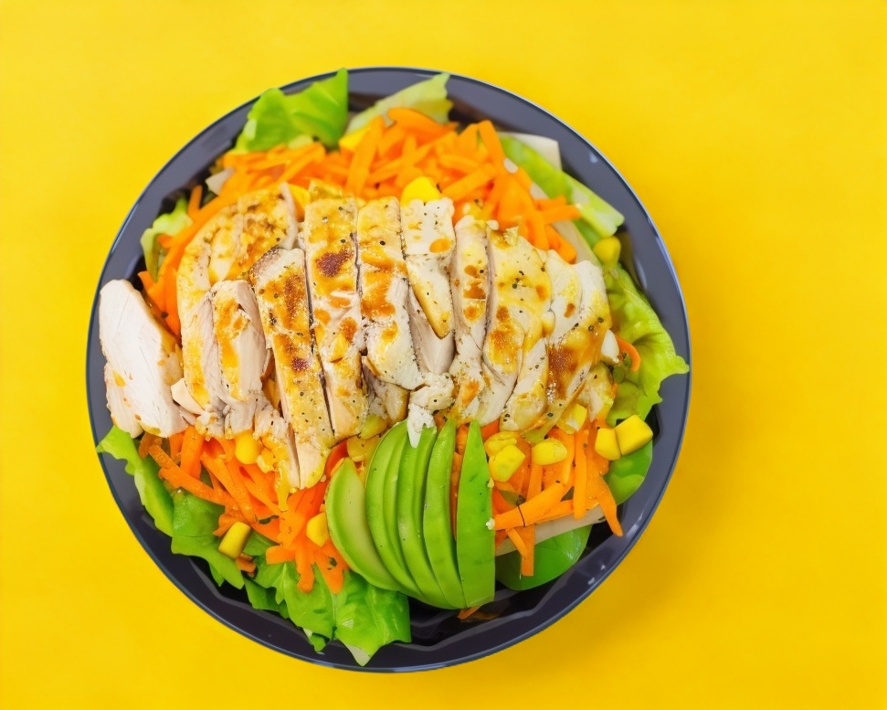 Lechuga orejona, zanahoria rallada, elote, pechuga de pollo, aguacate, aderezo chipotle