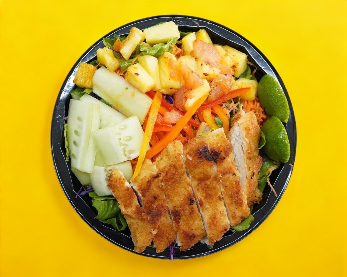 Pollo empanizado, Lechuga orejona, mix pimientos, pepino, repollo morado, trocitos de toronja, trocitos de piña, zanahoria rallada, aderezo chipotle ranch