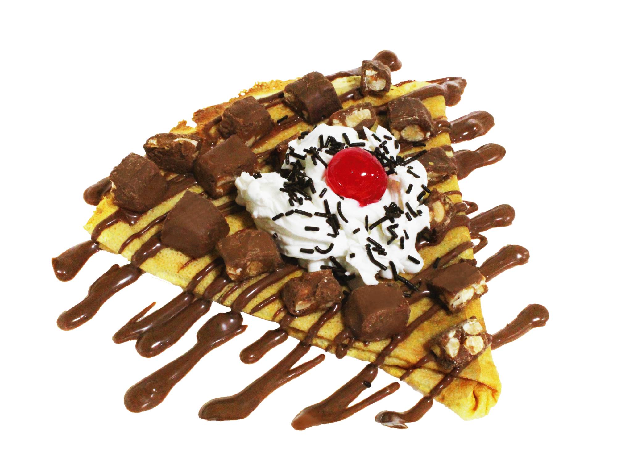 Deliciosa crepa cubierta de snickers, duvalin y cacahuate con relleno de Duvalin