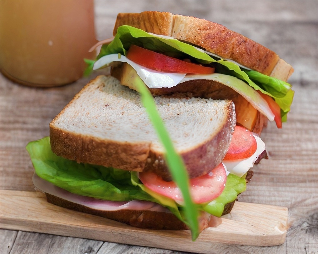 Pan integral, jamón de pavo, queso panela, lechuga, mayonesa, tomate, aguacate.