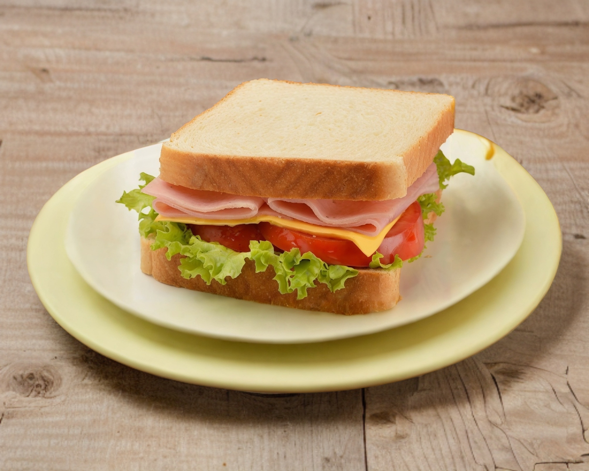 Pan blanco, queso amarillo, jamón de pavo, mayonesa, lechuga y tomate.