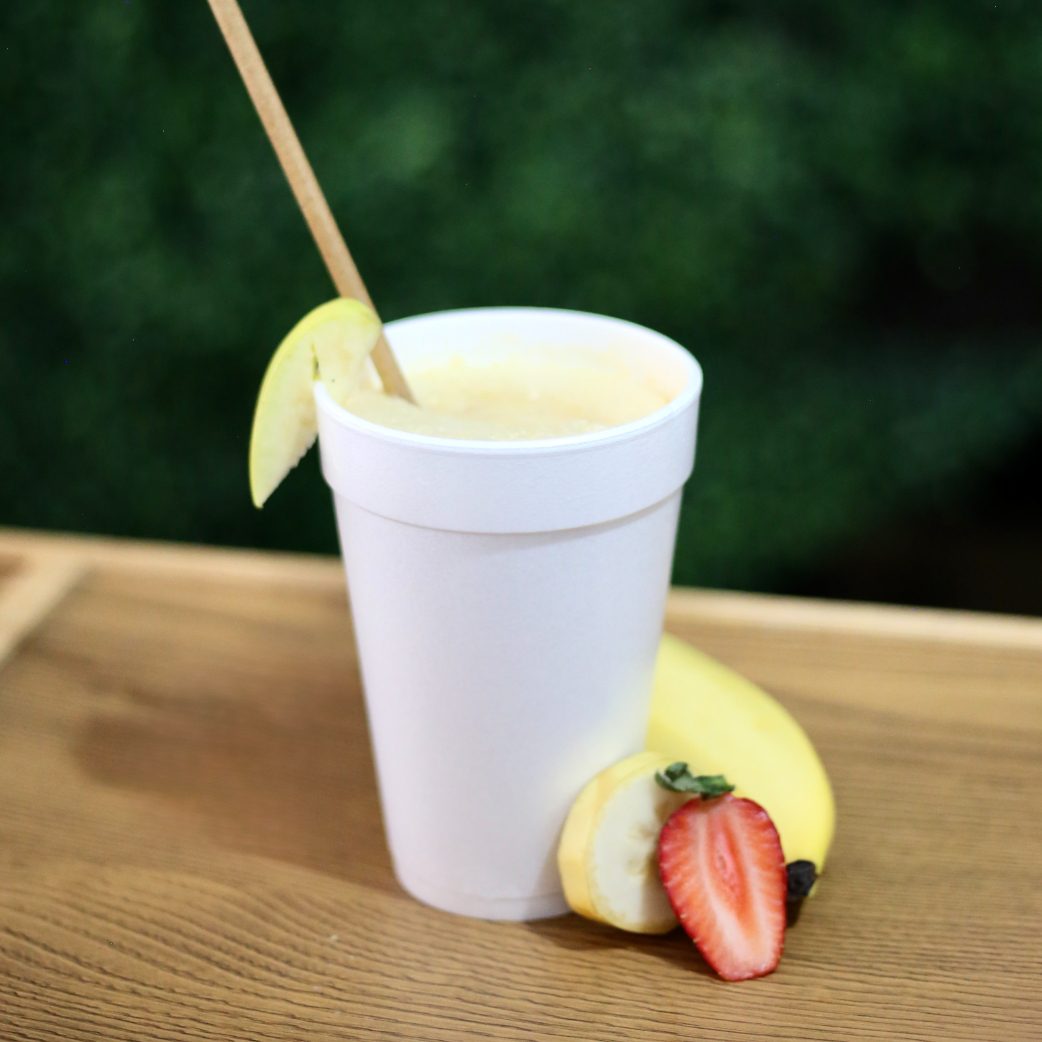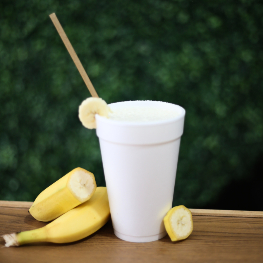 plátano, endulzante (azúcar, stevia o miel) y leche (entera o deslactosada) con un costo adicional puedes cambiar la leche a (almendras o coco)