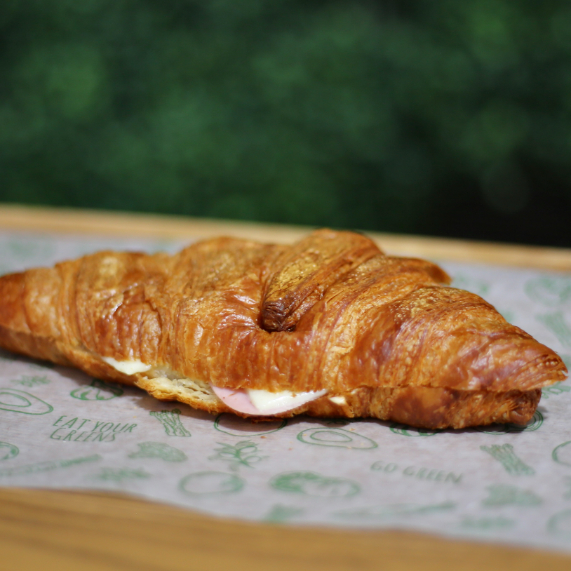 Croissant caliente, jamón, mayonesa y queso americano-suizo
