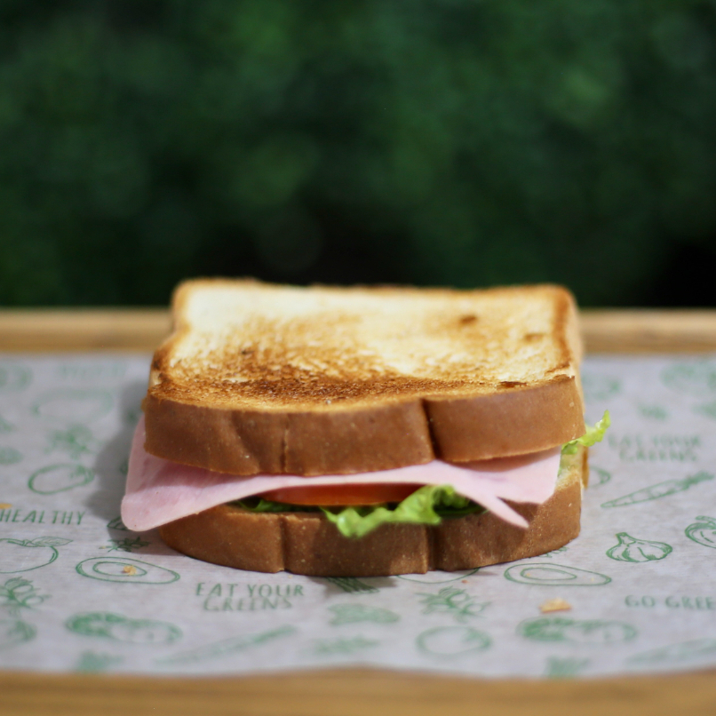 Pan blanco caliente, queso amarillo, jamón de pavo, mayonesa, lechuga y tomate.