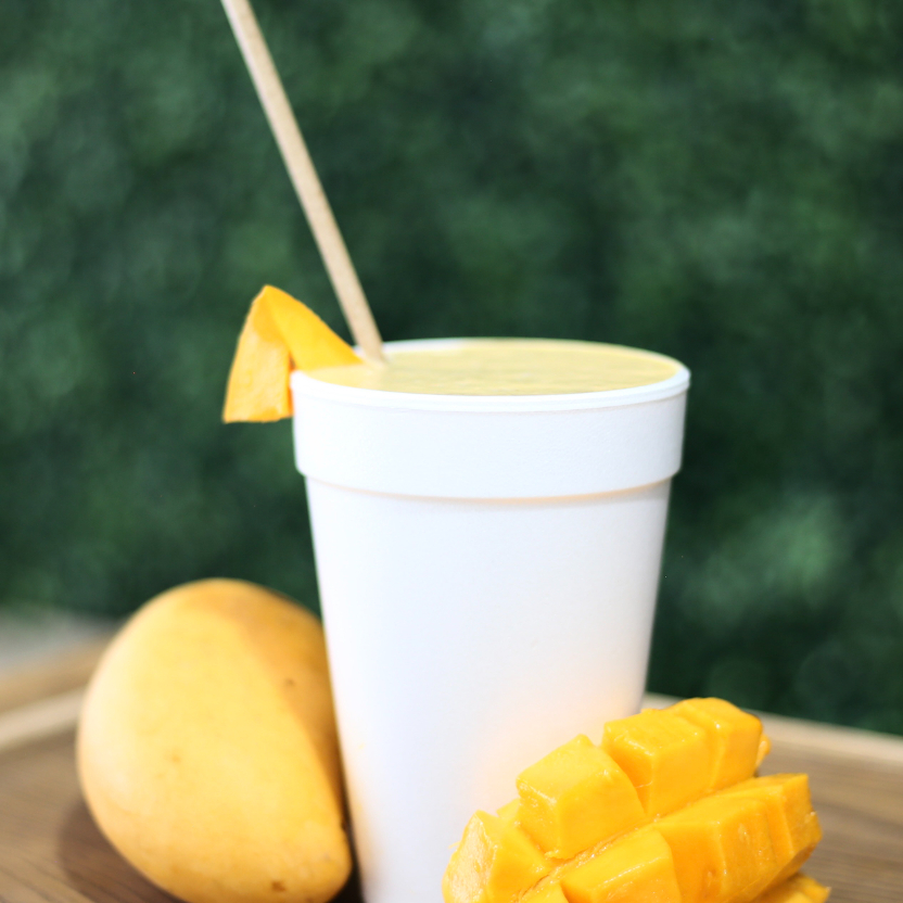 Mango, endulzante (azúcar, stevia o miel) y leche (entera o deslactosada) con un costo adicional puedes cambiar la leche a (almendras o coco).