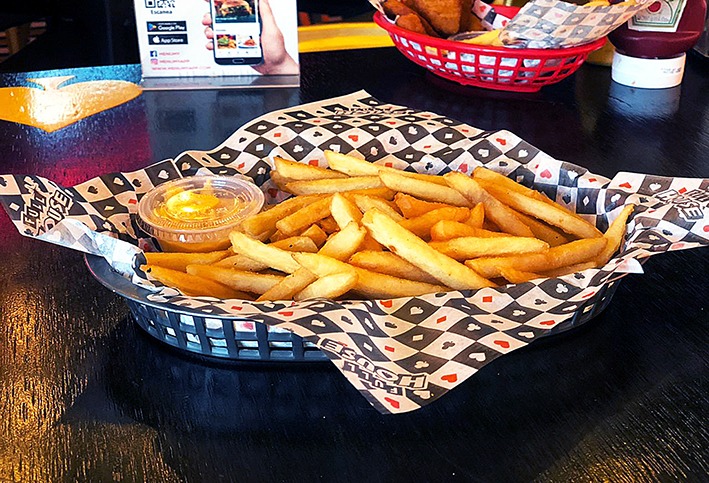 Tiras crujientes de pechuga de pollo (250 g) bañadas en tu salsa favorita, acompañadas de papas a la francesa o chips y aderezo, (ranch o blue cheese).