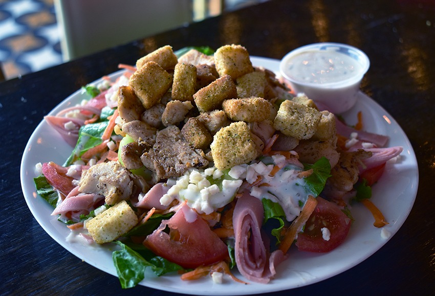 Ensalada de pollo, lechuga, pepino, zanahoria, tomate, jamón, mozzarella, crutones y aderezo a elección.