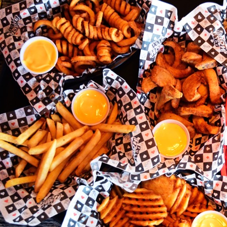 Papas con crujiente cobertura de malta de cerveza, acompañadas de aderezo de queso.