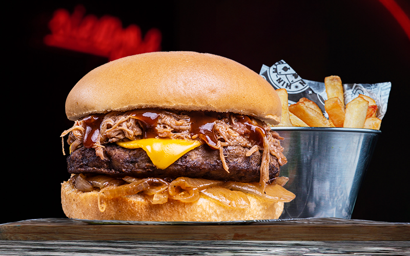 Hamburguesa con 150 g de carne sirloin, queso americano, carne pulled pork, cebolla asada, ranch y papas a elección.