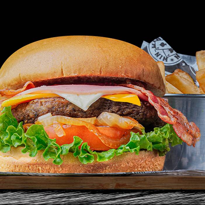 Hamburguesa con 150 g de carne sirloin, queso, jamón, tocino, aros de cebolla, lechuga, tomate, ranch chipotle y papas a elección.