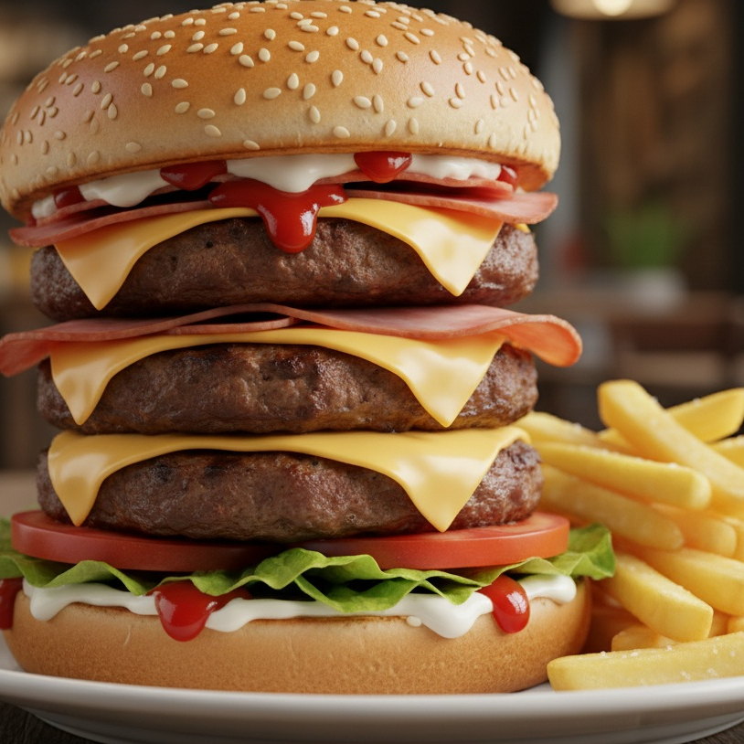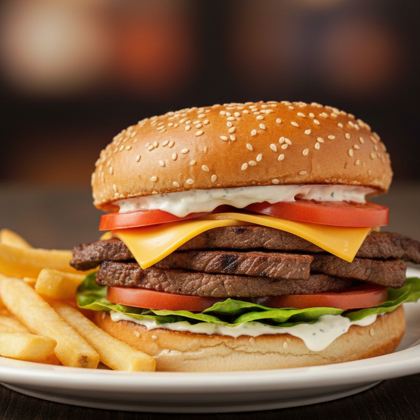 Pan de ajonjolí con 3 carnes, con queso amarillo, tómate, lechuga, queso amarillo, mayonesa, cátsup incluye; pequeña porción de papas naturales a la francesa fritas.